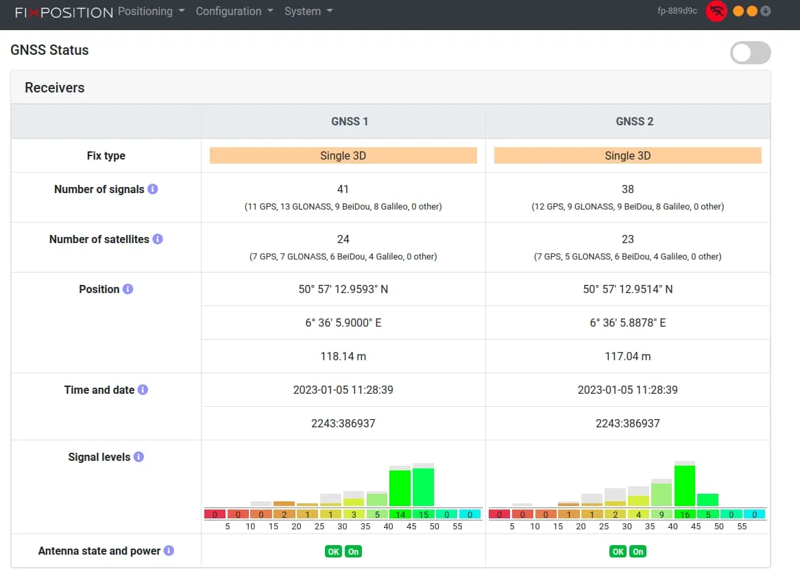 If the Fixposition is outdoors then you can verify the GNSS stream, by clicking