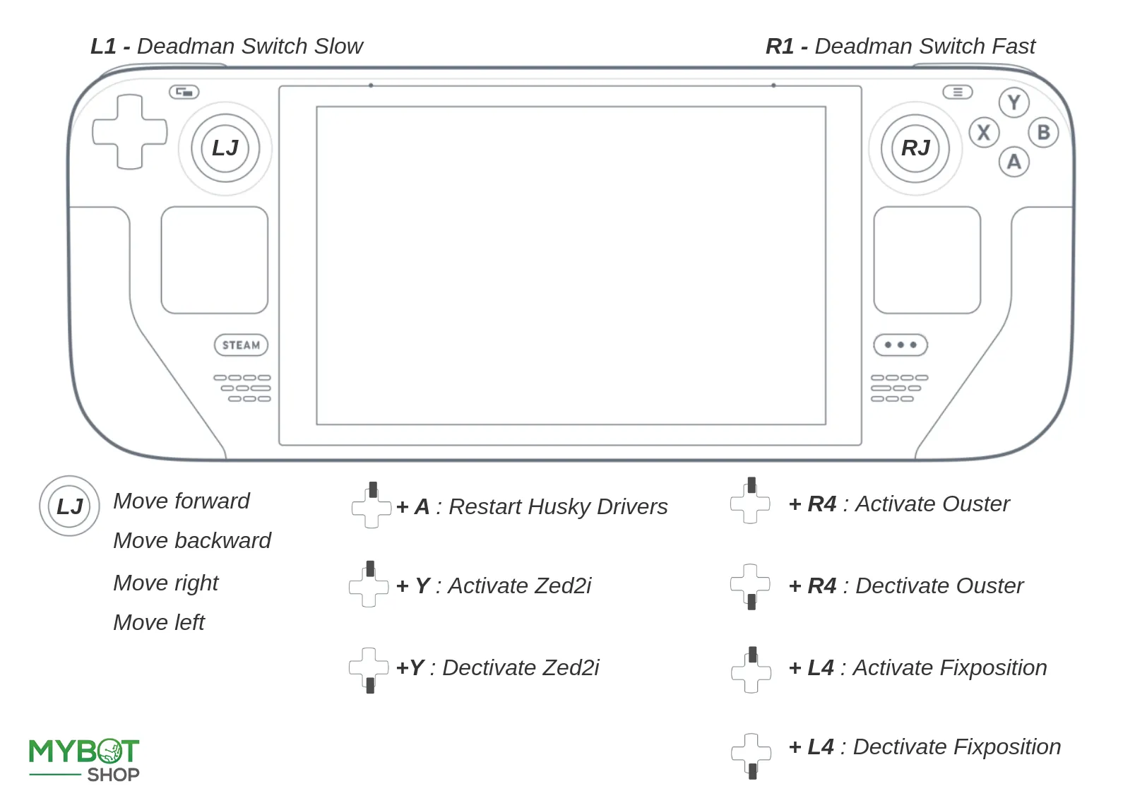 General controls for steamdeck. Specific robots may have different configurations, please consult the provided manuals for your robots.