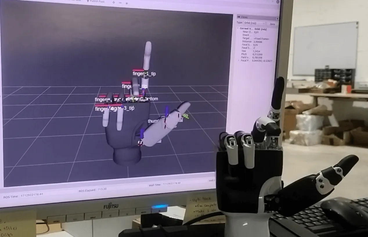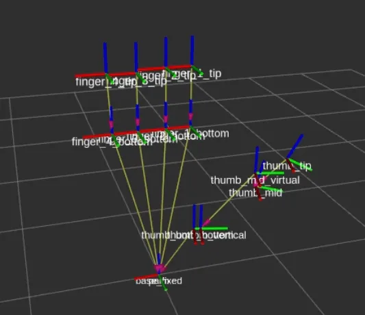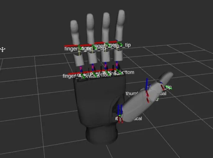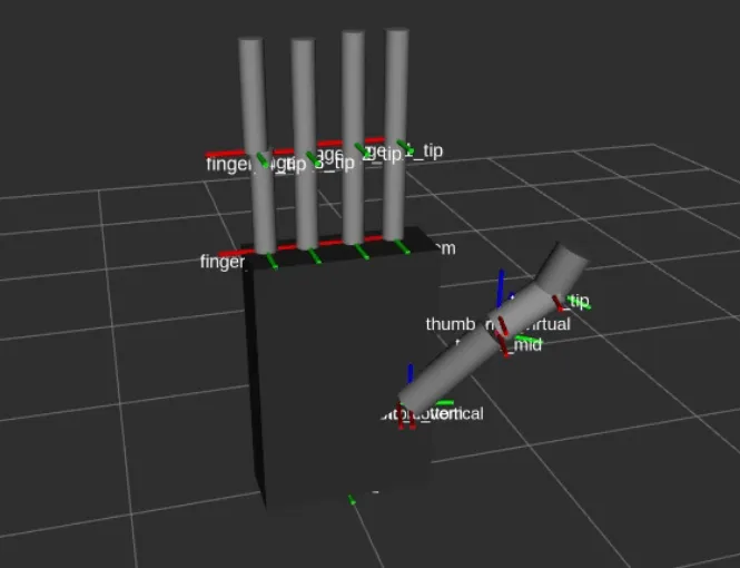 The driver publisher is created in C++ and the joints and parts are added in the driver publisher for two joints per finger and four joints in the thumb and with the help of a mathematical function, the state from zero to thousand of the joints is converted to the angular values. The angles are then published on the joint states topic to perform movements and collision checks with MoveIt. The end effector point for motion planning is selected just above the palm so that the gripper should not collide with the orange while traversing. The complete setup, after integration of geometry and transforms, is tested with MoveIt planning interface with RViz plugin |