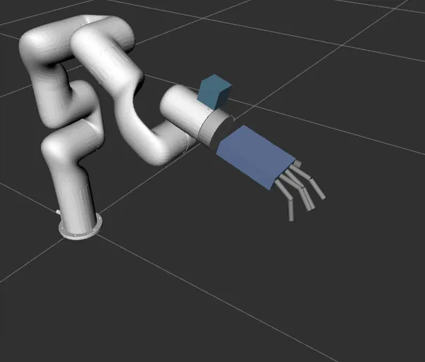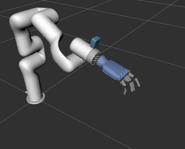 The d405 camera model is integrated into the URDF with the meshes for the visual tag and a box geometry is assumed for the collision to reduce the computation load. The gripper geometry is a combined model in STEP format and it is separated part by part in Fusion360 software to integrate the joints and movement of fingers and thumb for motion planning and grasping. In finger joints, joint rotation is mimicked for the fingertip if the finger base is rotated. The thumb can rotate on two axes, in one rotation, there are three joints mimicking the motion of the thumb base and for the other joint rotation, the whole thumb rotates.