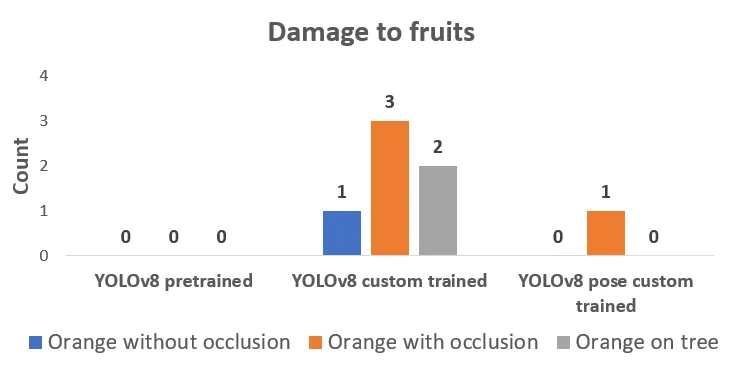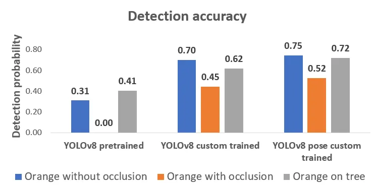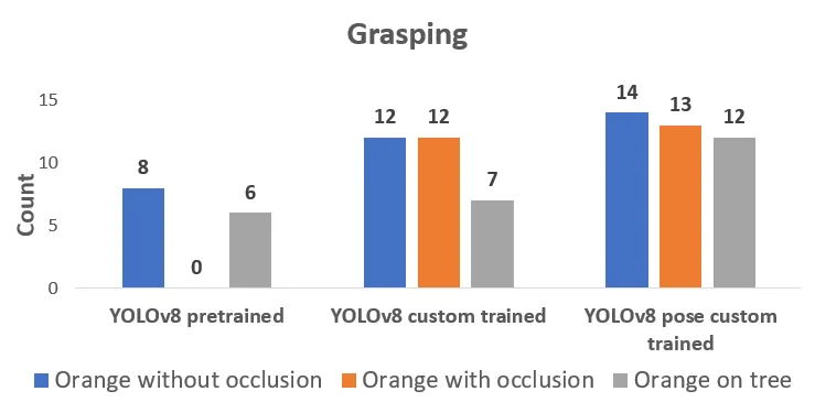 Pre-trained YOLOv8 model has performed poorly when it comes to detection accu racy and grasping attempts. The reason is that the Calamondin orange fruit has a smaller size when compared with other varieties of oranges. Whereas the custom- trained YOLOv8 object detection and pose model have performed better than the pre-trained model with YOLOv8 pose having higher detection rates. The overall detection accuracy with YOLOv8 pose averages more than 50% in the test cases including occlusion cases and five to seven percent higher than YOLOv8 custom- trained object detection model.