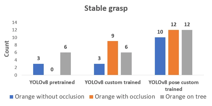 The successful grasping attempts with YOLOv8 pose have been the highest in each of the cases and YOLOv8 custom-trained is closer while performing the grasping. However, most of the time fruit has fallen off prematurely before reaching the placing pose with YOLOv8 custom-trained, thus, causing damage to the fruit. The fruit shape approximation is more accurate with YOLOv8 pose model.