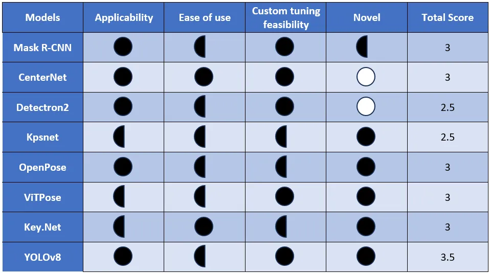 YOLOv8 pose estimation has the highest score and it turns out to be the suitable model, and the next section discusses and tries to understand the model in depth.