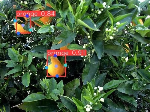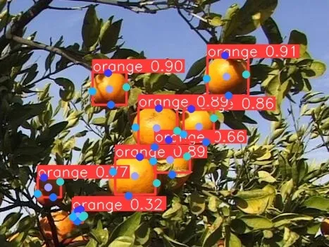 The goal is to detect orange from any configuration and keeping in mind the manual annotation part as well, around 180 images have been selected for training including images from the camera for robot setup and around 50 for validation. The five key points have been selected on fruit for the orange detection with YOLOv8 model: top, center, bottom, left, and right key points in orange.