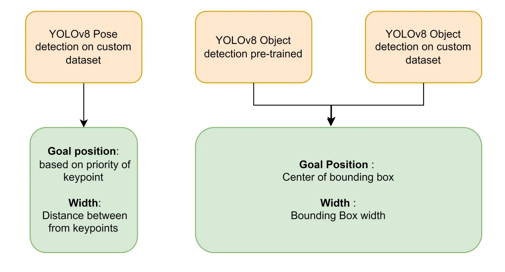 Based on the confidence values of bottom and center points with a threshold value of 0.5. One key point is selected in the proposed approach so that there is a good confidence score for the goal position. The center of bounding boxes for YOLOv8 object detection models are selected.