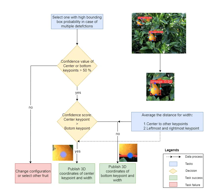 During fruit harvesting on a tree, fruits are usually adjoined or nearby to one another. Thus, a strategy has to be developed, when multiple fruits are detected. The higher detection probability rate lowers the risk of causing damage to robot setup and also achieves the task accurately. Thus, the priortization is given to high detection probability fruit for goal position for robot motion plan. The workflow has been shown in Figure below. When multiple detections are made by the YOLOv8 models: