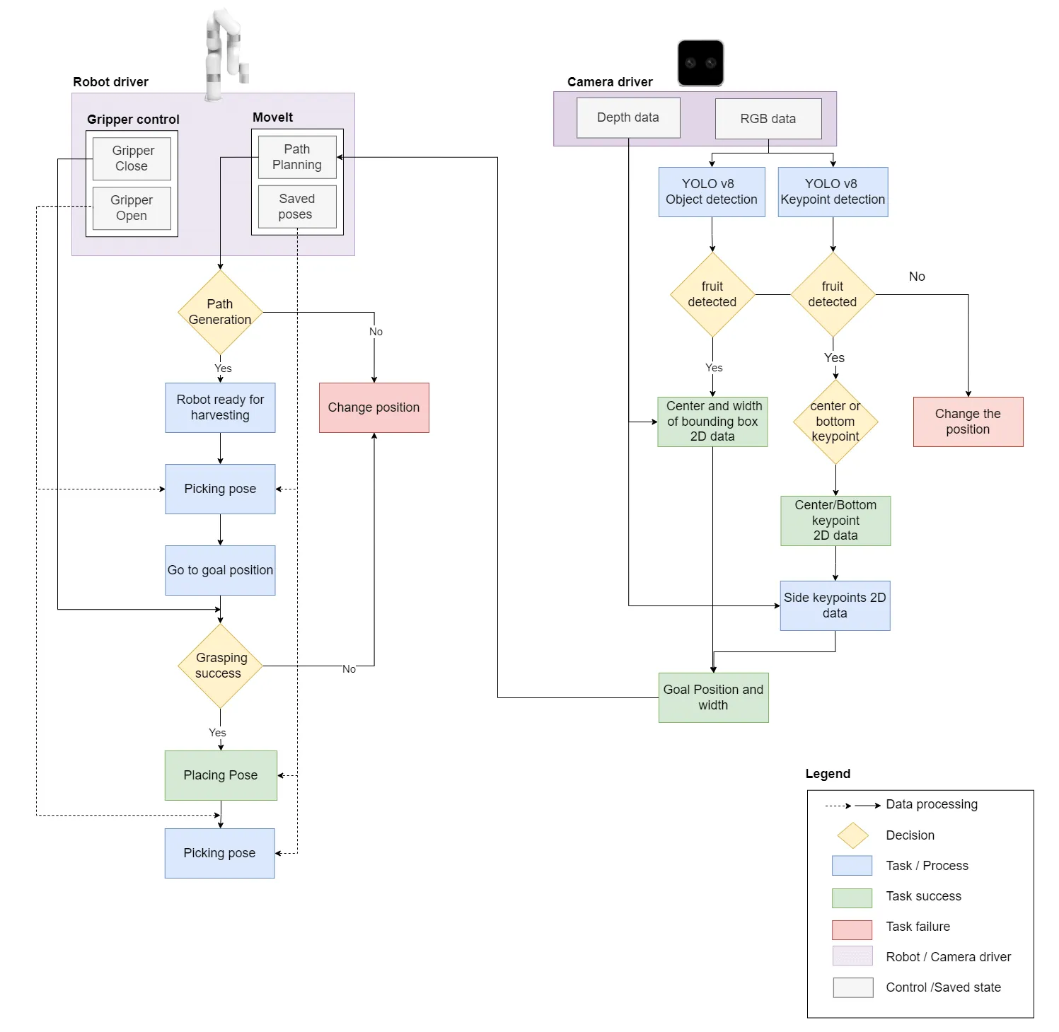 An approach is built upon [Ref.] for the keypoint model due to the similarity with the object detection-related works methodology. The methodology takes RGB-D data as input from the camera node, which publishes them on a ROS topic. The key point detection node subscribes to the image topics and performs key point detection on the image. The depth information is then fused to obtain 3D coordinates of the key points and then published them. The goal position and the width information are extracted from the key points. The path for goal position is estimated with IK solvers in MoveIt for path planning. Once the plan is ready, the move group node of MoveIt makes the robot arm traverse to that point with the closing and opening of the gripper, the fruit is grabbed and then dropped at the fixed position.