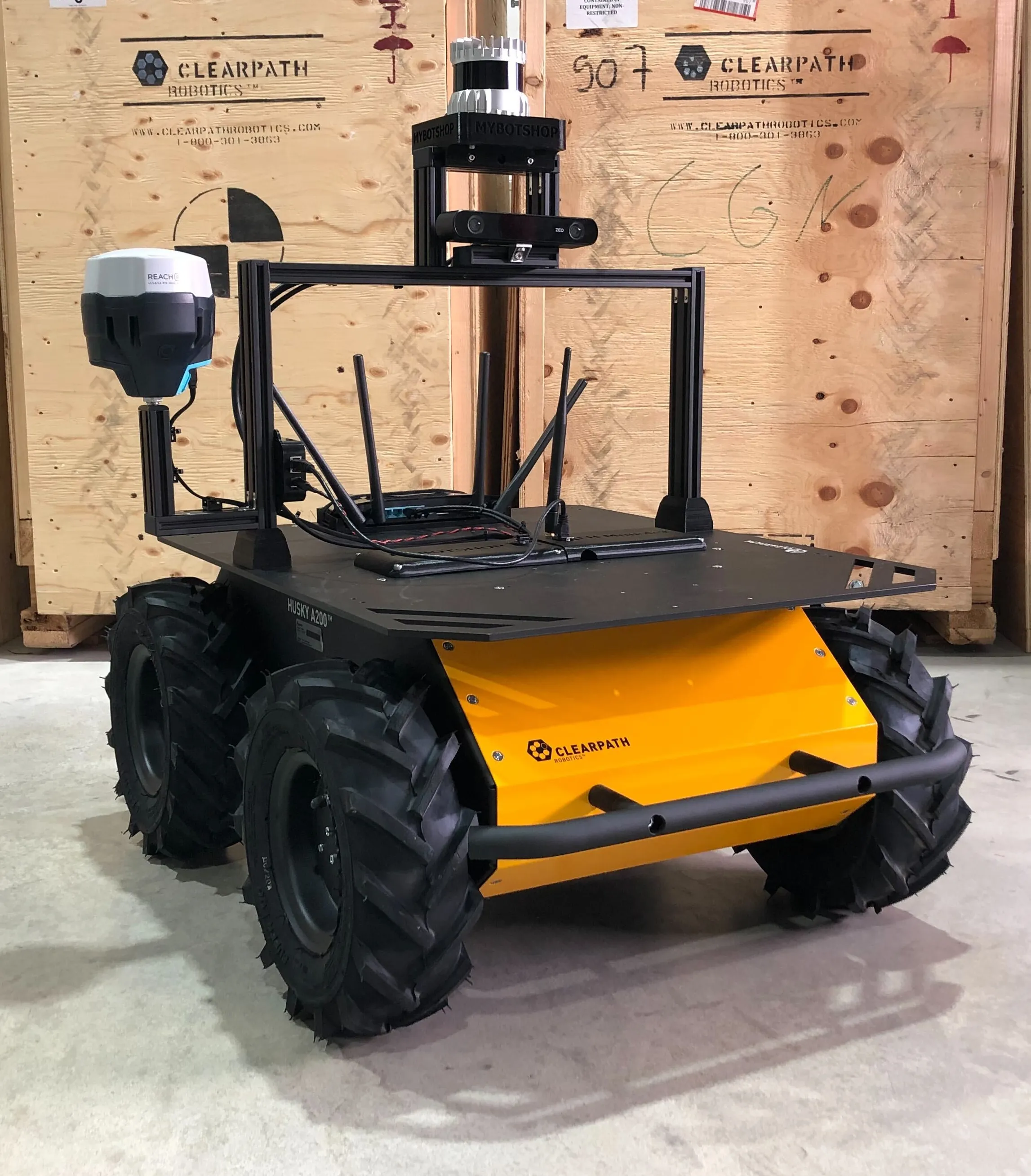 This specifies the configuration for Husky MU. It has an ouster lidar, reach rs2 gps, nvidia board, ZED2 depth camera, router, and arduino nano that acts as a power relay.