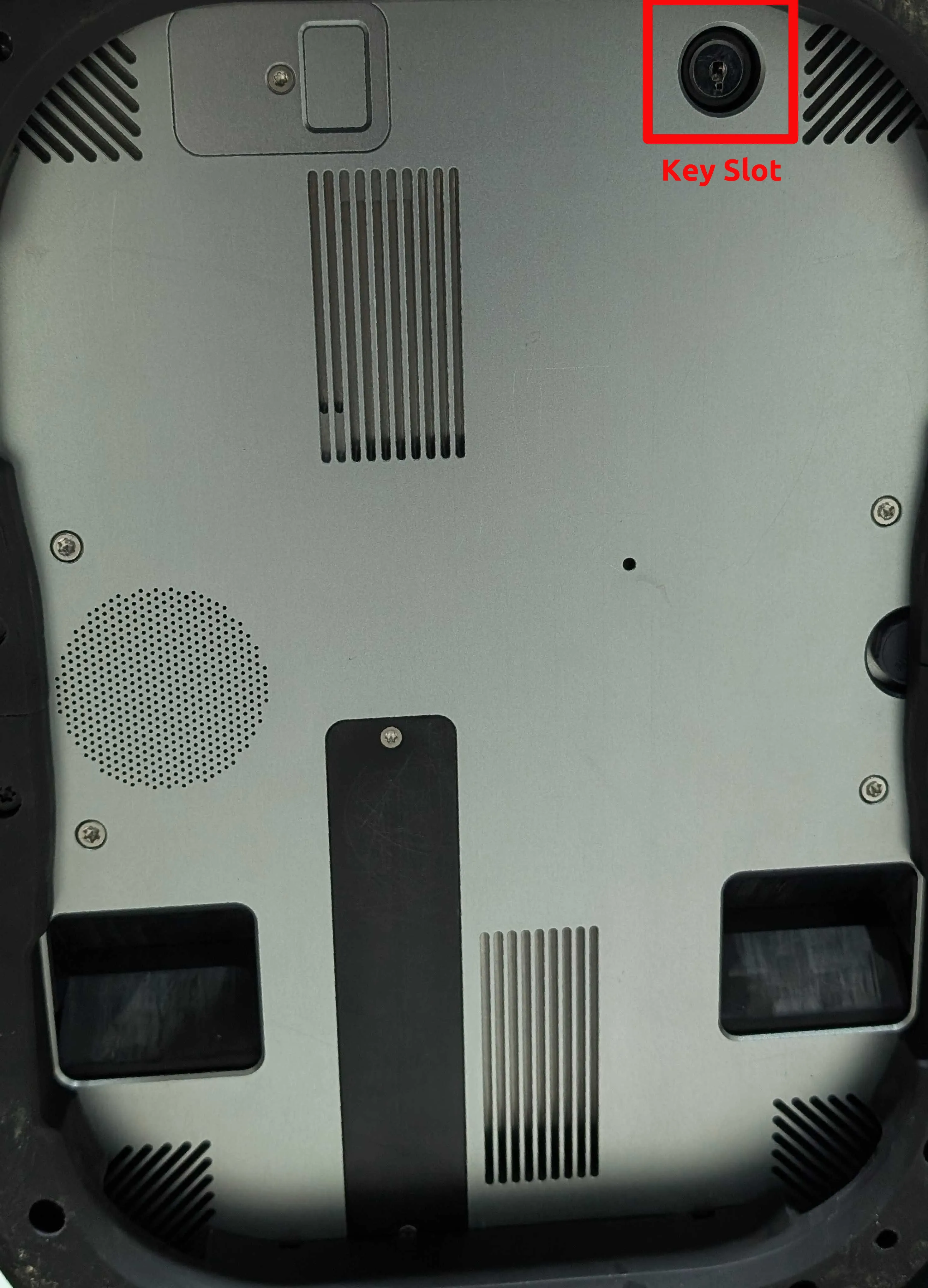 Insert the key into the bottom slot and turn it clockwise to unlock.