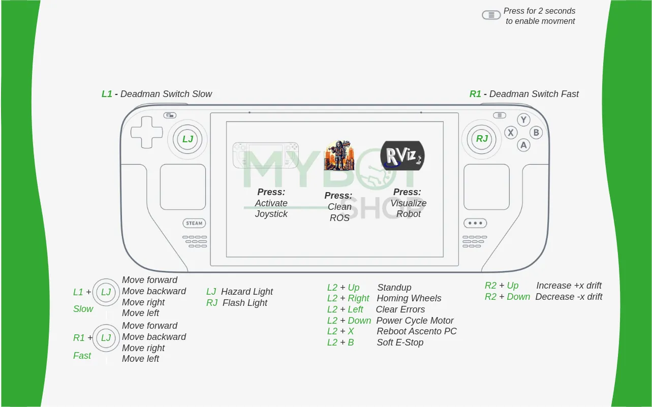 The Ascento robot can be manually controlled using the Steam Deck controller. To begin, connect the Steam Deck to the Ascento robot’s Wi-Fi. Once connected, use the Activate Joystick function to establish communication between the Steam Deck and the robot.