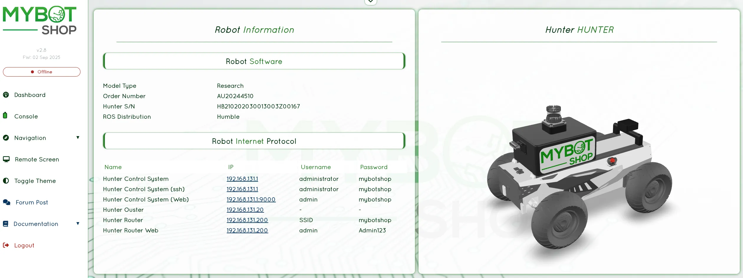 If the Hunter is configured with an onboard computer, a web interface may be available.