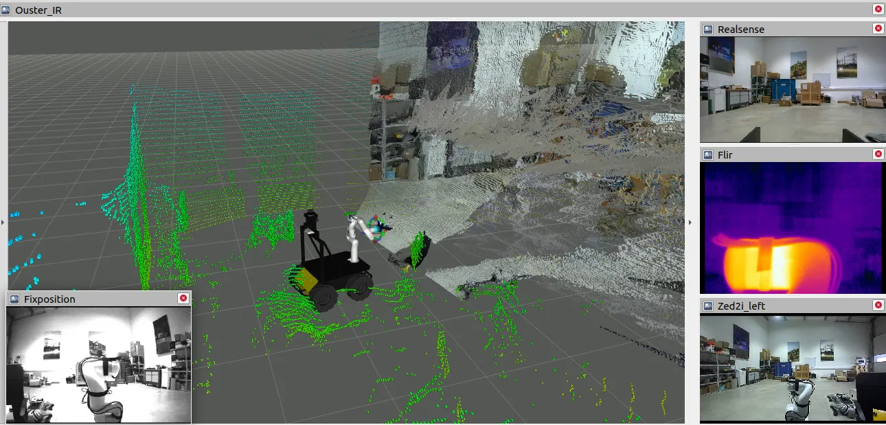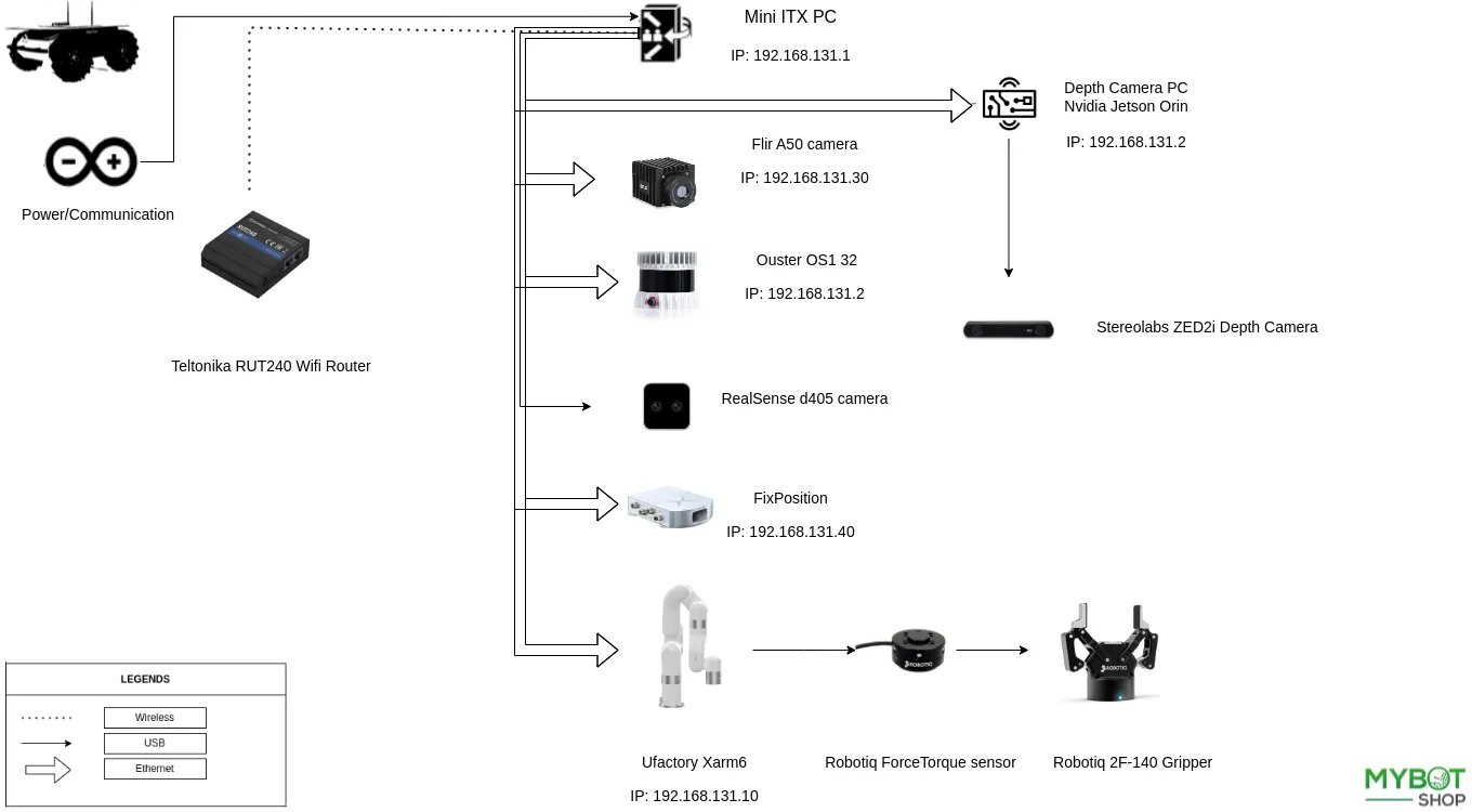 This specifies the configuration for Husky FH. It has an ouster lidar, Fixposition gps, nvidia board, ZED2 depth camera, Flir thermal camera, Realsense depth camera, Ufactory xarm6,Robotiq gripper, Robotiq Force torque sensor and router to establish wireless connection with the robot via WiFi.