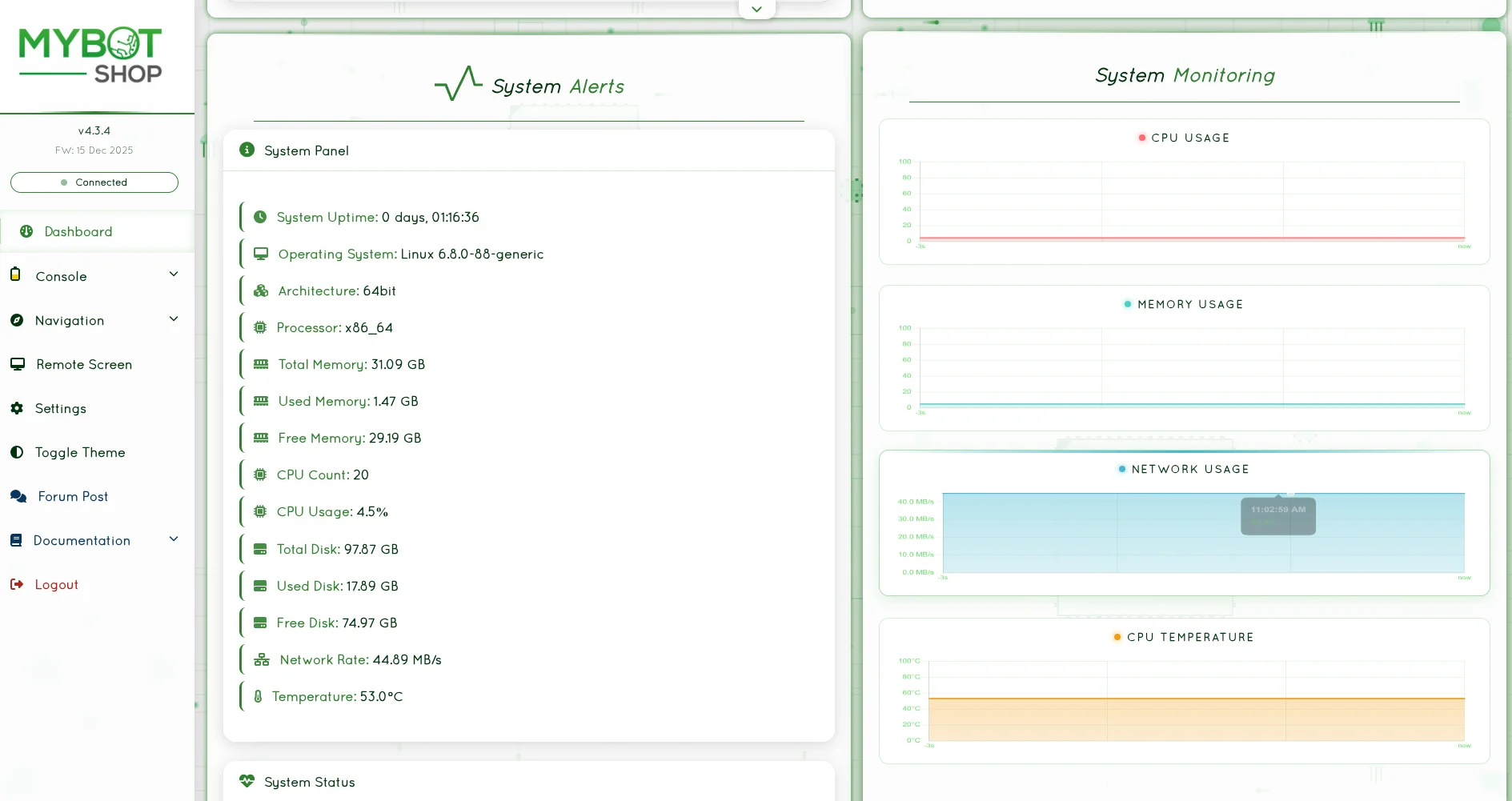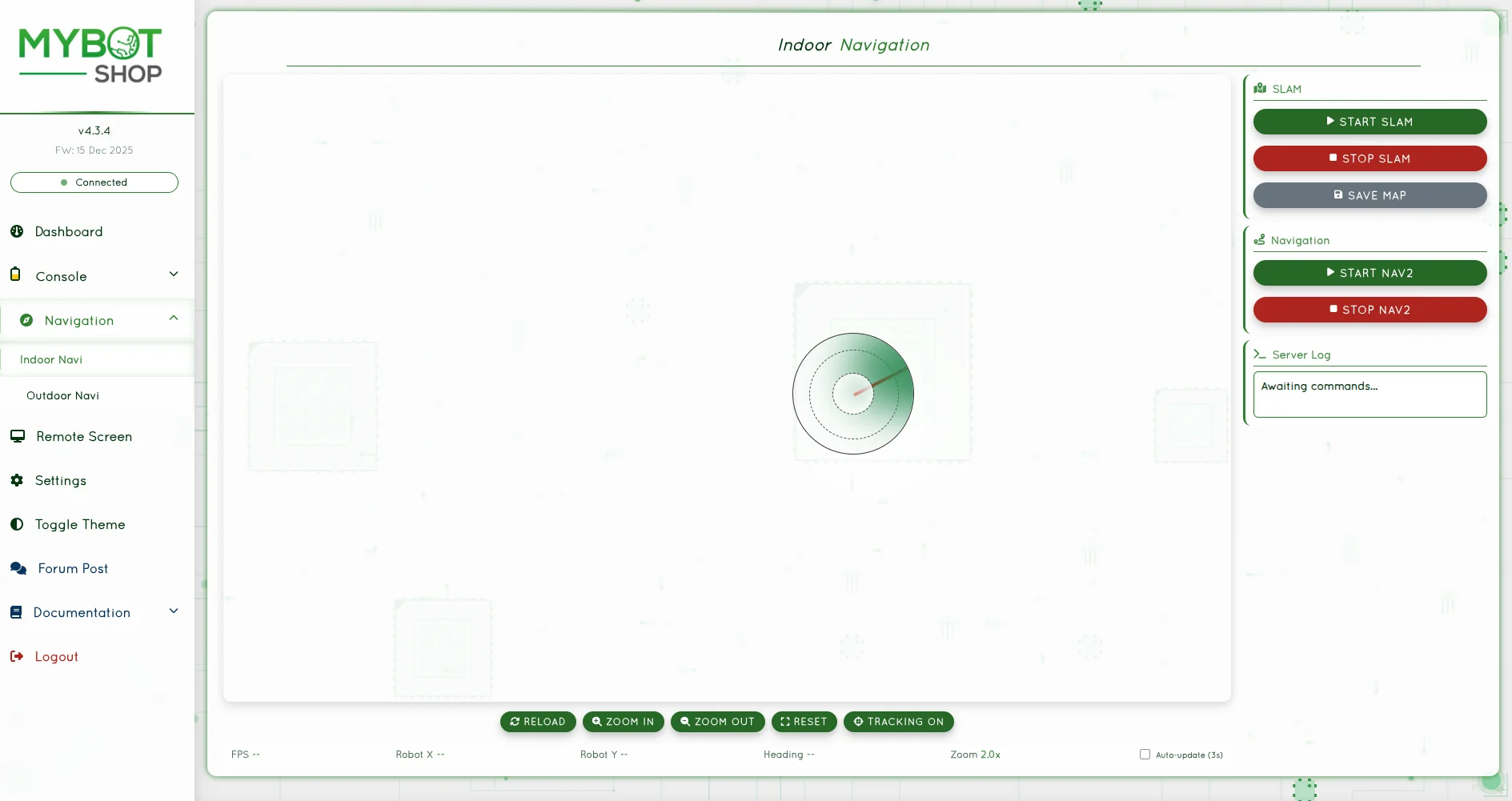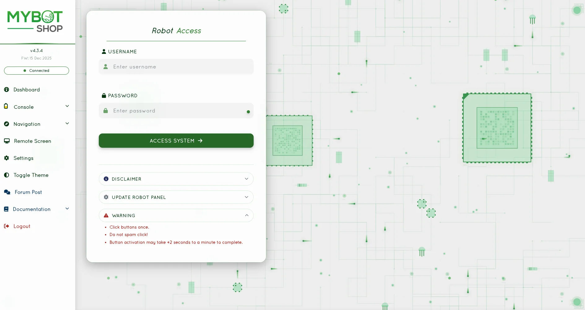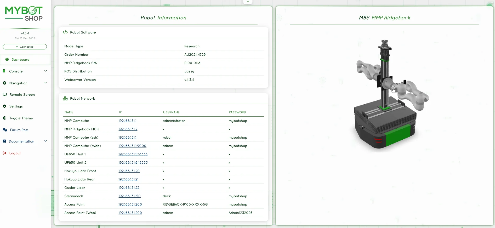 The webserver username is admin and password is mybotshop.